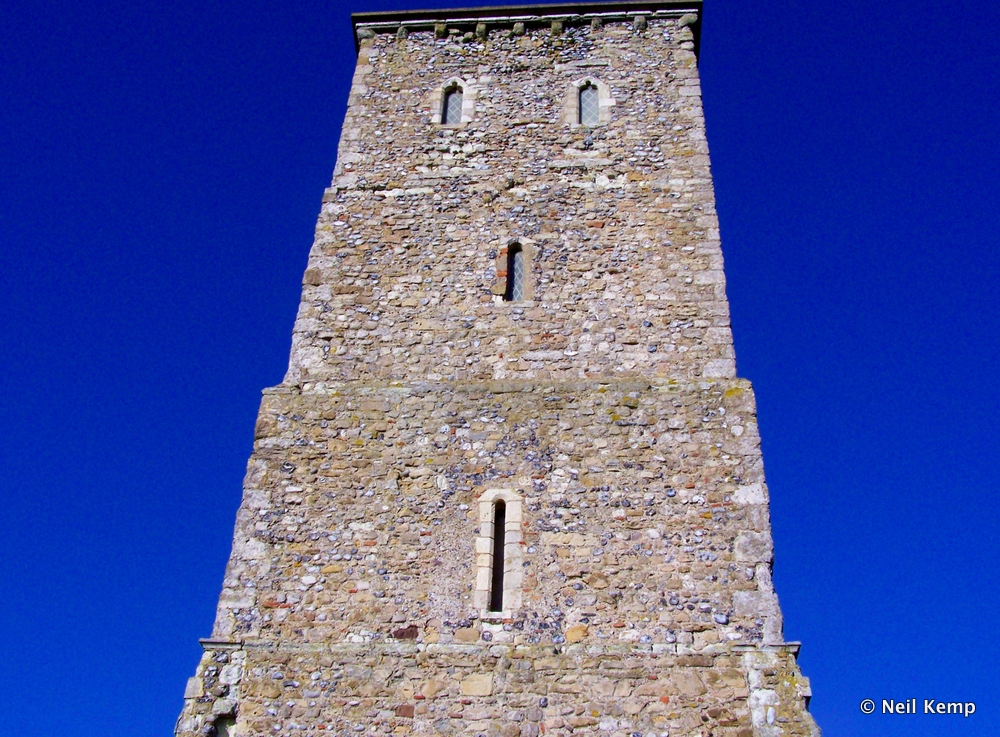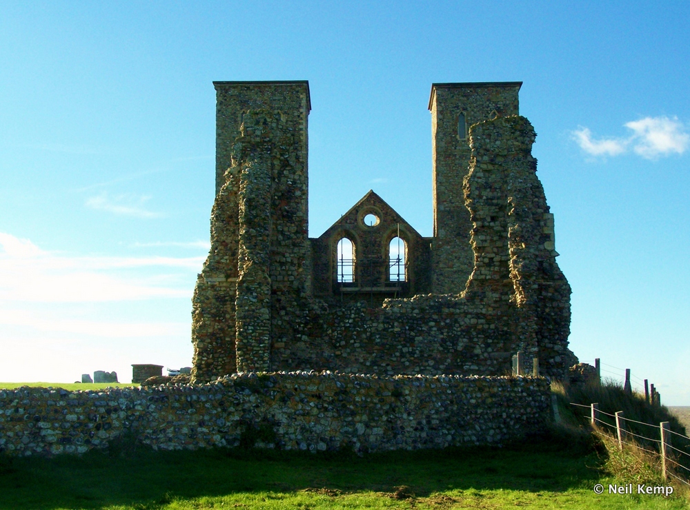The twin towers still survive amidst the ruined remains of the old Roman fort and even today make an imposing monument against the sea on one side and the flat marsh lands of the now completely silted Wantsum on the other. It is hard to believe, given that the once might Wantsum is now little more than a drainage ditch, that the channel separating Reculver from the Isle of Thanet was over two miles wide during the Roman occupation. As this channel has now disappeared, it is rather ironic that the sea has taken most of the fort due to coastal erosion at the old mouth of the Wantsum and it is only the implementation of coastal flood defences that have allowed the towers to remain.