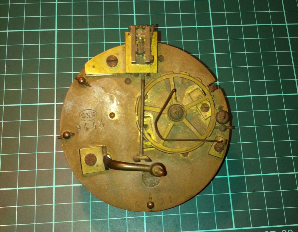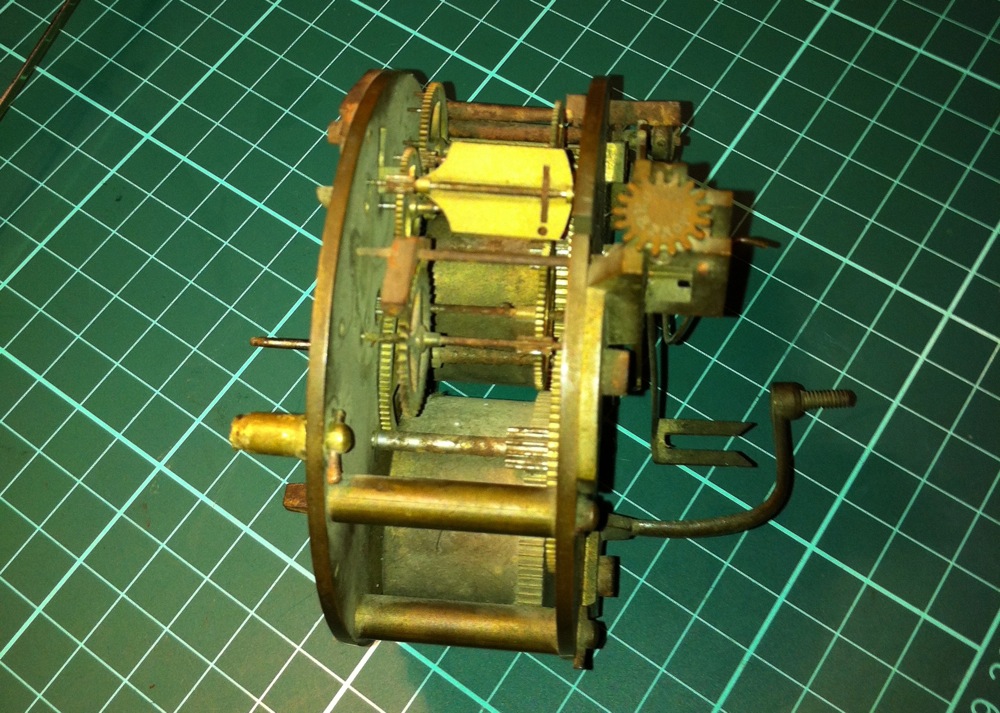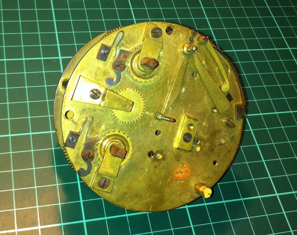 The movement is aged and tarnished, with rust on the steel arbors and pinions. It also had a broken mainspring, was missing the hour wheel and the escapement adjustment rod.